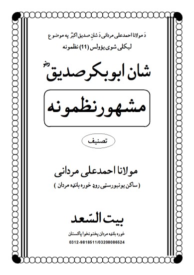 مولانا احمدعلی مردانی کی دیگر تصانیف کی طرح یہ بھی ایک بھترین کاوش ہے جس میں مولانا موصوف نے شانِ صدیق اکبر ؓ کو منظوم شکل میں بیان فرمایا ہے ۔ اور قارئین کے لیے یقینا دلی سکون کا باعث بنے گا ۔ ان شااللہ ۔۔۔۔۔۔۔۔۔۔۔۔۔۔ اصحابِ رسول ﷺ سے محبت رکھنے والوں کے لیے یہ ایک انمول تحفہ ہے ۔۔۔۔۔۔۔۔۔۔۔۔۔۔۔۔مولاکریم موصوف کی کاوش کو شرفِ قبولیت سے نوازے ۔ آمین